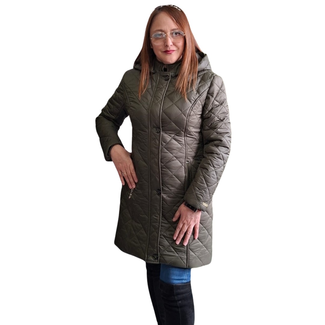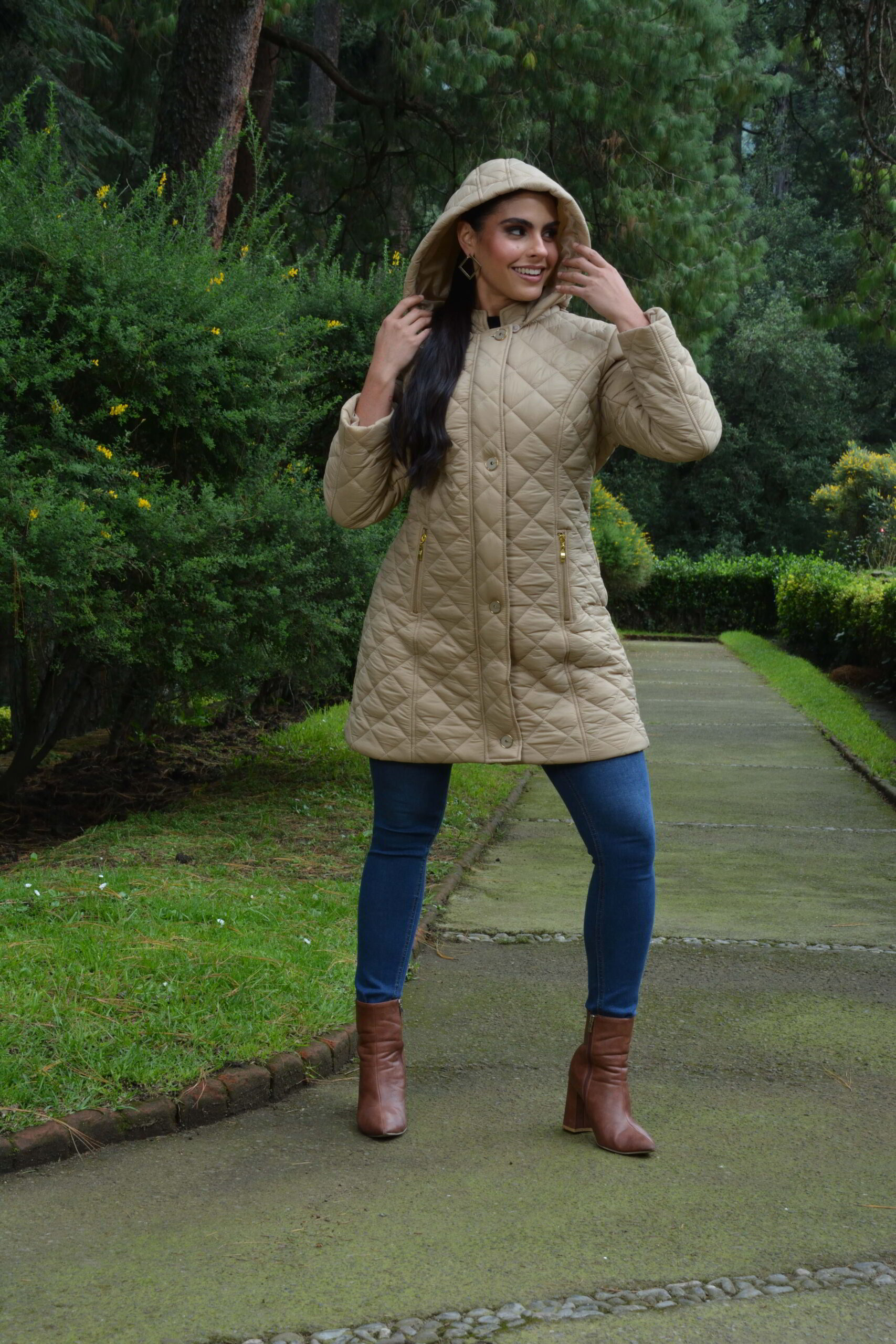 Chamarra larga con capitonado en rombo, con cierre, y gorro desmontable